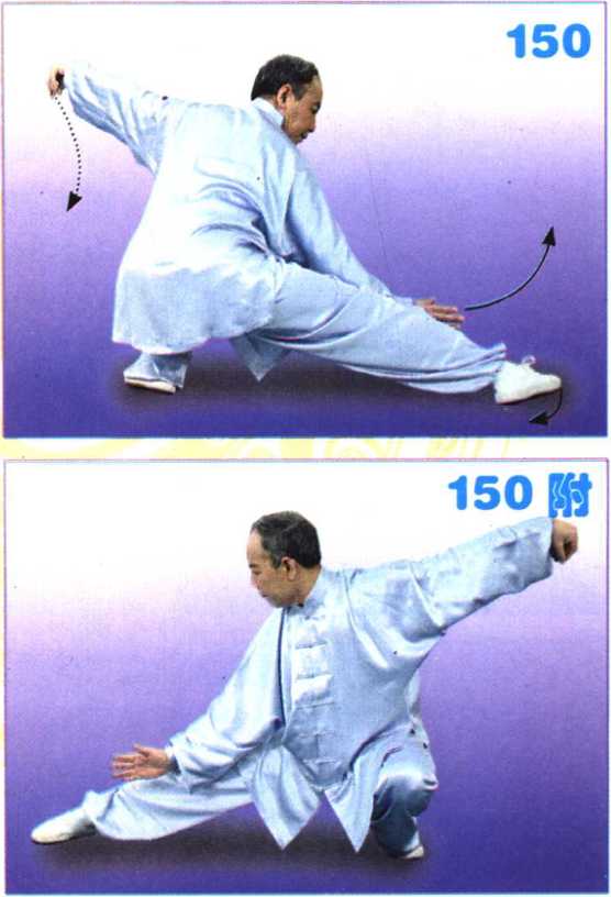 右腿稍屈,左脚落于右脚内侧后 方,重心后移;左手翻转下落,右手向 下伸展。(图153)