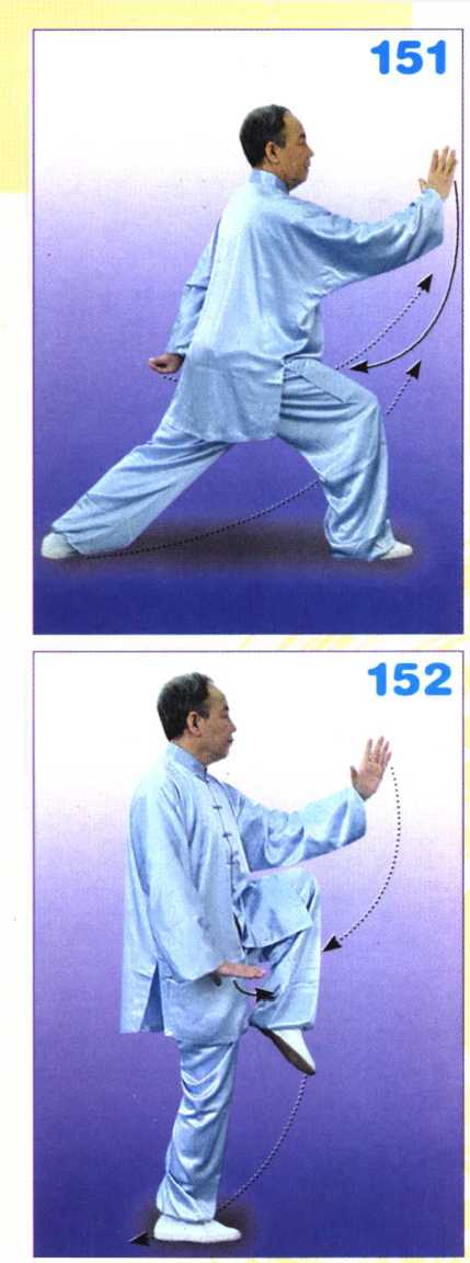 重心前移,上体右转,左腿屈膝向 前上提起,脚尖下垂,右腿微屈站稳, 成右独立步;左勾手变掌,经体侧向 前、向上挑起,成侧立掌,指尖高与眉 齐;右掌翻转下按于右胯旁;目视左 掌。(图152)