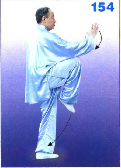 上体左转,右腿屈膝提起,脚尖下 垂,左腿微屈站稳,成独立步;左掌按 于左胯旁;右掌成侧立掌挑至体前,指 尖高与眉齐;目视右掌。(图154)