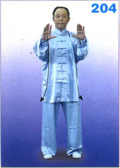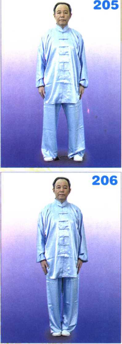 两掌慢慢下落至两腿外侧,松肩垂 臂,上体自然正直;目视前方。(图 205)