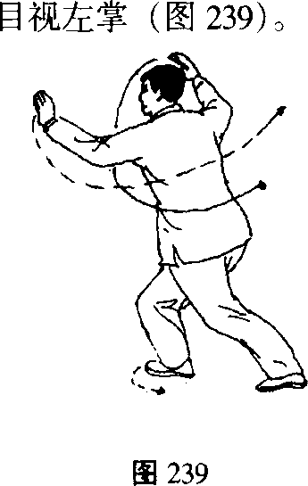 上体后坐,身体重心移至左腿,右脚尖翘起内 扣全脚掌踏地,同时身体向左后转,左掌经右掌上 方向左后划弧平抹至身体左前方,掌心斜向下,右 臂微外旋,掌心向上,向左划弧收至左肘内下方; 目视左掌(图240) ,