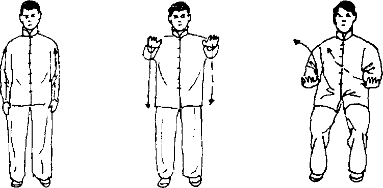 【动作】(一)开步直立动作同“搂膝拗步”中的“(一)开步直立” (图 248) ,(二)两臂前举动作同“搂膝拗步”中的“(二)两臂前举” (图 249) o(三)两拿下按动作同“搂膝拗步”中的“(三)两掌下按”(图 250)。图248 图249 图250