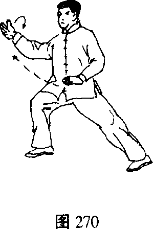 上体右转,右脚向右前迈一步,脚跟先落地, 而后重心移向右腿,右脚全脚掌踏实,左腿自然伸 直,脚跟外展成右弓步同时右前臂向前上搠出, 高于胸平,掌心向内,左掌向下按于左胯旁;目视 右前臂(图270)。