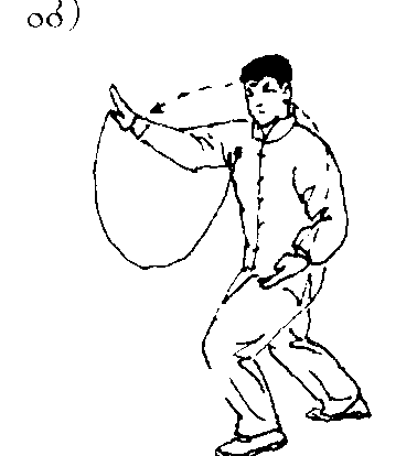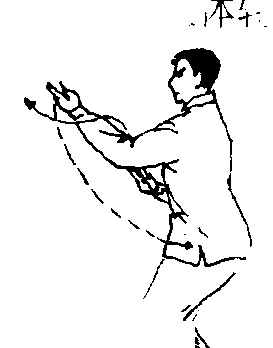 身体重心前移,上体左转,右掌从左前臂上方 穿出,向上、向中划弧展开,左掌向下、向左划弧 至腰侧;头随上体转动(图88) :