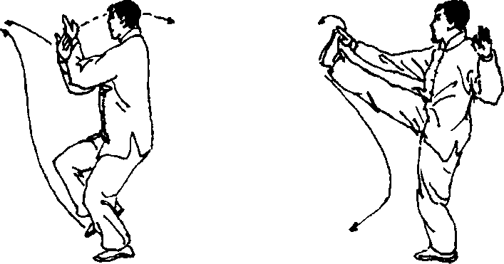 左腿支撑身体,微屈站稳,右腿屈膝提起,右 脚向右前方慢慢蹬出,脚尖上勾,脚跟高过腰部, 两掌分别向右前方和左方划弧分开,掌心向外,腕 与肩平,两臂伸展,肘微屈,右臂与右腿上下相对; 目视右掌(图90)。