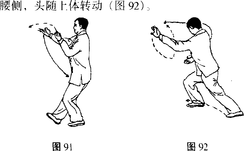 右脚屈收向右前落步,右臂外旋右掌心转向上, 稍向内收,左掌下落,经腰间向前、向上划弧伸至 右肘内侧,掌心向下;目视右掌(图91),