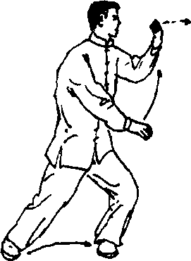 上体继续左转,右脚收于左脚内侧落地,两脚 平行向前,相距10?20厘米,两掌云至身体左侧逐 渐翻转,左掌心转向外,右掌云至左肘内侧,掌心