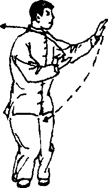 身体重心右移,上体右转,右掌自左经面前右 划弧云转,指尖高与眉齐,左掌向下经腹前向右划 弧云转;目视右掌(图117)。