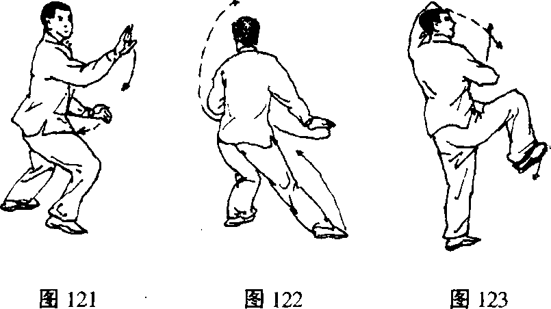 两掌逐渐握拳,左拳经体侧屈臂上举至左额前 上方,拳心向外,拳眼斜向下,右拳屈臂收于左胸 前,拳心向内,拳眼朝上;左腿支撑身体微屈站稳, 右腿屈膝提起,右脚收至裆前,脚尖上翘并内扣, 头转向右前方;目视前方(图123)。