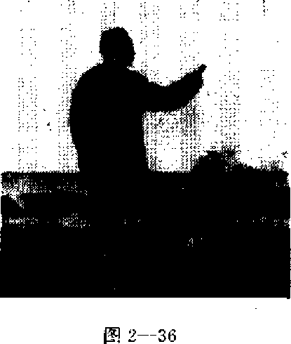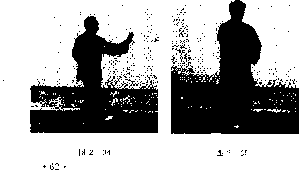 重心前移,上体稍右转,左脚跟步收于右脚内侧(初学者 左脚尖点地成左步右从右下方向右、向上、向体前划 弧,最肟卷收于体前;右在划弧过程中,由掌心向上逐渐翻 转成掌心向下,掌高与肩平;同时左掌逐渐握拳,向下、向狞划 弧收胸前,拳心向下,拳面阳右;目视前方 (图2—35)