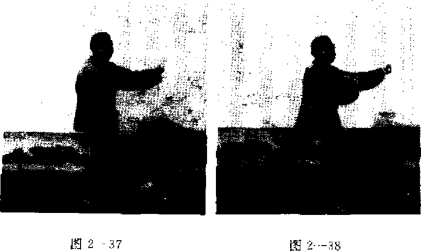 左脚向左前北°左右迈出一步、脚跟着地,脚尖外撇,左 膝微屈,成左虚步;身体左转,同时左拳翻转拳心向上,左臂外 旋,左举经朐前向上、向体前划弧撇出,高与胸平。搬拳动作要 活肖然,劲力顺达,左前臂和上臂之间的夹角约为120°。右 常冋时经左前臂外侧顺势由丨:向划弧按于右胯旁,两掌动 作同时完成。做该动作要用身休的微向左转带动手脚动作,使 之配合得协调一致,眼随体转,目视左拳。(图2 36)