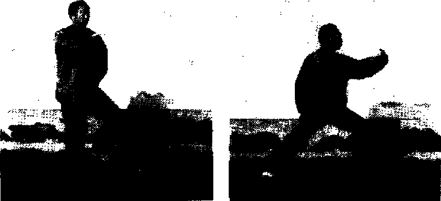 蚩心前移,右脚踏实.右膝微屈,左脚慢慢向前收回落 “脚内侧,足尖点地成左丁步;司时右臂内旋,右掌由下经右 腰间向侧、右上方划弧,掌心逐渐转向,然后继续向上、向