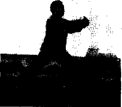 爭心前移,左腿屈膝冇腿慢慢蹬立成左弓步;叫,同时 卩落,经腹前昀前、向沿弧线推按。腕卨与肩?,两?保持勹
