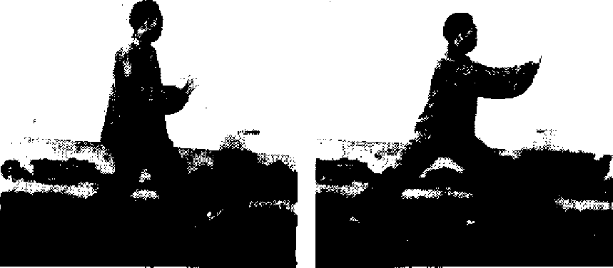 卜1体微向左转,重心前移,左脚向前迈出一步,足跟先落 地然后全脚掌踏实,左腿屈膝,有腿蹬直成左弓步.两脚横向 距离约10厘米;同时左锌逐渐内旋成弧形向前上方棚出,掌 心转向内,高与府平;右掌成弧形向厶下方按掌至右胯旁;目