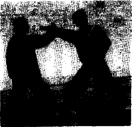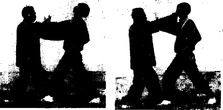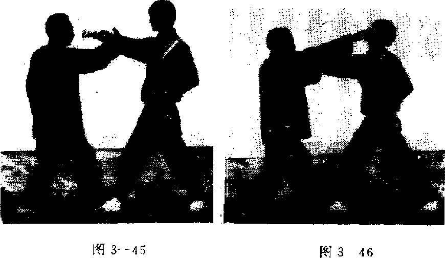 甲方以“顺弓步右冲拳”攻?乙方胸部,乙方用左前臂棚 架来拳。(图3—44)