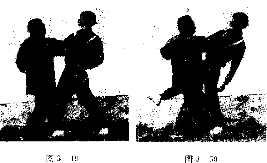 屮方用右拳攻击乙方胸部,乙方用左手抓握其腕并句后 拉引(图:纟一49);当甲方欲后冋拉右臂时,乙方顺势用右前 臂栅击甲力1肋部,将甲方堋出以至倒地( 3 __5).。