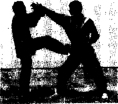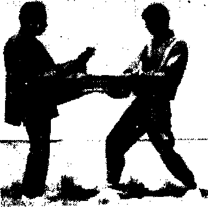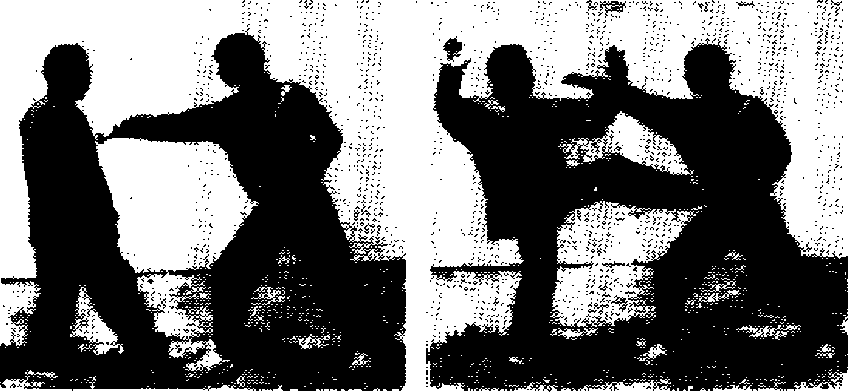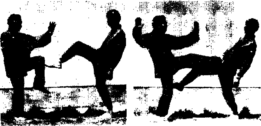 甲方用“冲拳”或“推掌”攻击乙方头部或胸部乙方双手 “十”字契挡,同时起脚蹬击甲方裆部或腹部(图3—135)。