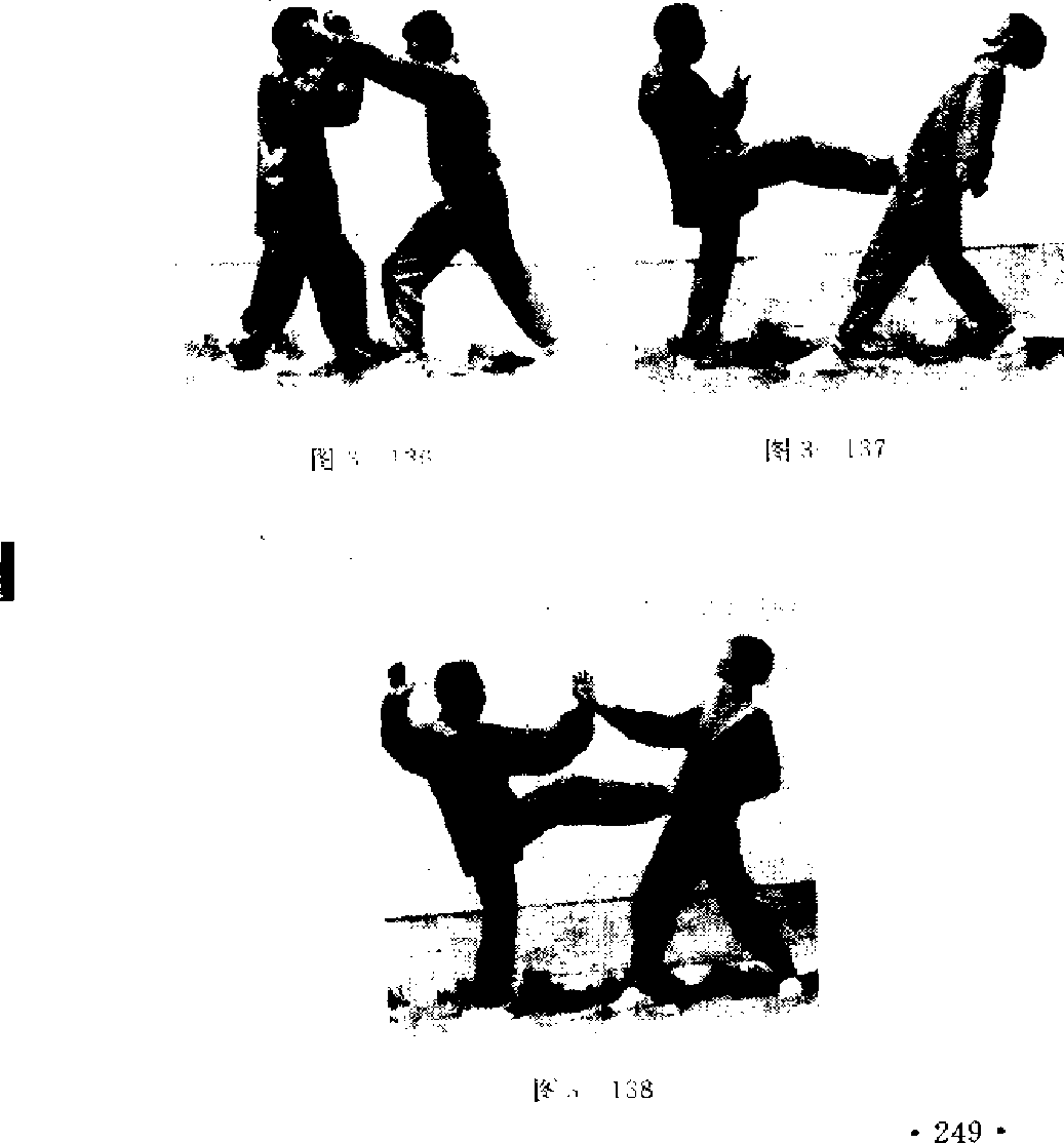 屮心分啣”弹出乙方腹部,乙方前腿提膝阻把(图 139_>; 甲方被阻欲回收农腿的一瞬间,乙方急速呻膝蹬 击甲方抱部(图3 11〇)。