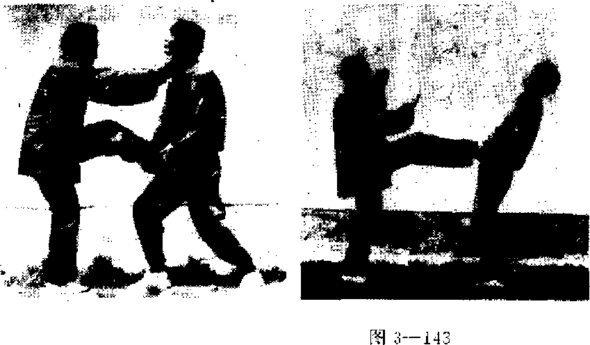 乙方发“左蹬脚”攻击甲方腹部,甲方双手抄抱乙方的腿 (图1);乙方左小腿用力回收将甲方拉近,随即用两手 掐击申方喉部(阁3—142);当甲方喉部被掐欲向后移动并用 双手托解脱时,乙方用左脚蹬击甲方腹部(图3—143)。