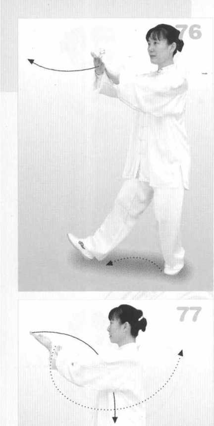 (2) 右脚前进半步,重心前移 至右腿,随之左脚跟进落于右脚后 面,脚前掌着地;两掌翻转提到胸 前,同时向左、向前划平弧,右掌 心向上,高与肩平,左掌心向下附 于右腕内侧。眼看右掌。(图76、 77)