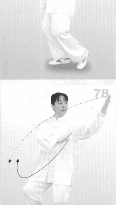 .(3)重心移向左腿,上体左转, 左前臂外旋,左掌向下、向后划弧 上举,手心斜向上,高与头平,右 掌经面前向左划弧,按于左胸前, 掌心向下。眼看左掌。(图78)