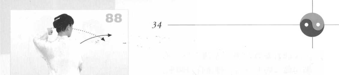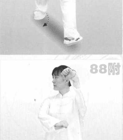 (5) 上势不停,左拳向右屈肘 平贯,停于左额前,拳心斜向外; 右拳向左平贯,停于左肋前,拳心 斜向下。松腰、松胯。眼转看右前 方(正东)。(图88、88附)