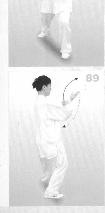 (6) 重心后移,左脚尖内扣, 上体右转;同时两拳变掌,左掌收 于胸前,掌心斜向上,右掌掌心斜 向下,从左前臂上方穿出;眼平看 前方。(图89)