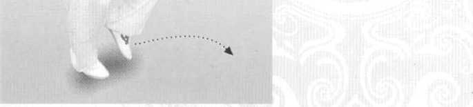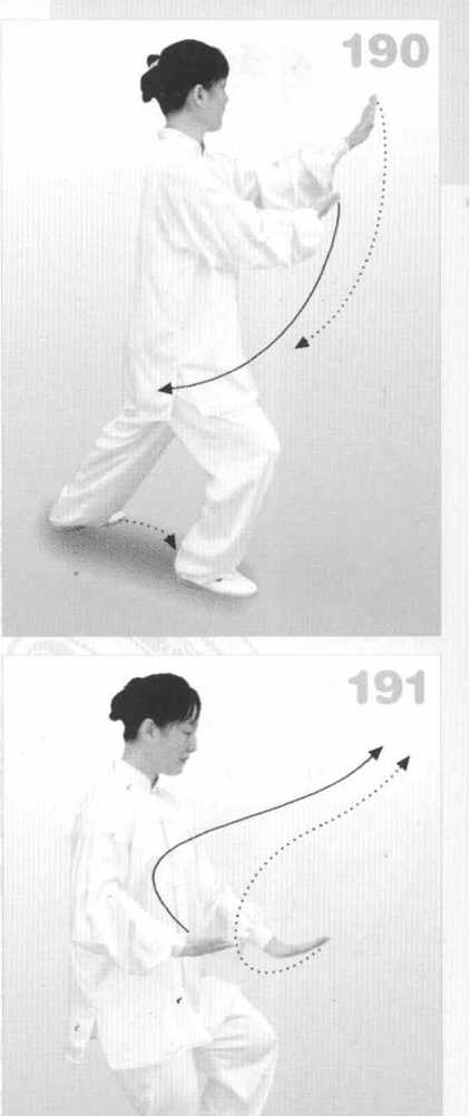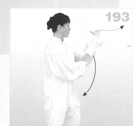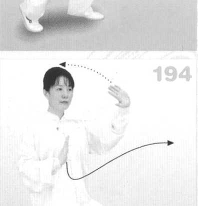 (6) (5)上体左转;左臂屈肘,左 掌向左、向后划平圆,掌心斜向上; 右掌仍附于左腕内侧;右脚同时向 前跟进半步,脚前掌着地。眼看左 掌。(图193)右脚落实,重心后移于右 腿,左脚提起,上体右转;右掌自 左前臂内侧收于胸前;左前臂内旋, 左掌翻转,掌心斜向前。眼看右前 方。(图194)