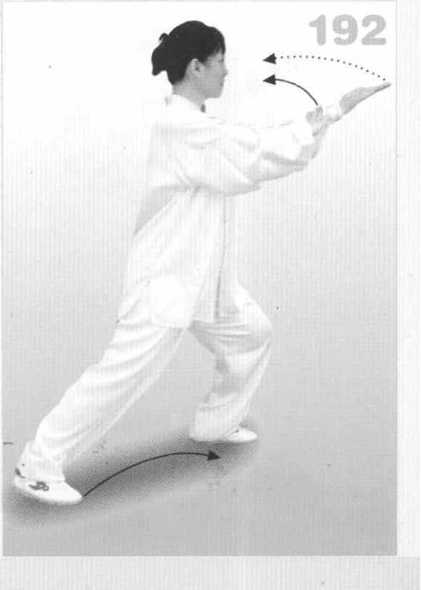 (5)上体左转;左臂屈肘,左 掌向左、向后划平圆,掌心斜向上; 右掌仍附于左腕内侧;右脚同时向 前跟进半步,脚前掌着地。眼看左 掌。(图193)