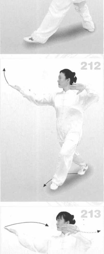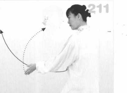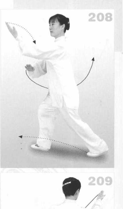 (3) 左脚向左前方(西南)上 步,重心略向前移成半马步(身体 重心偏于右腿),上体稍左转;左前 臂下落经腹前向前靠出,左臂微屈 停于身体左侧,左拳拳眼向内,拳 面向下停于左膝上方;右掌落于左 肘内侧,掌心向前,推助左臂向前 靠出(此动作也可采取短促发力练 法)。眼看左前方(西南)。(图 210)