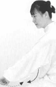 (2) 重心后移至左腿,右脚提 起,脚尖转朝前成右虚步;上体向 下松沉,微向前俯;左掌自上而下 横按于右膝上方,掌心向下,拇指 向内;右掌按于右胯旁,掌指向前。 眼看前下方(图206) 【要点】