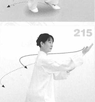 (3) 右脚前掌为轴,脚跟外展, 屈膝下蹲,身体重心移向右腿,上 体左转,左脚问后(西北)撤步; 两掌随体转向左平捋至体前,右掌 伸向东南,高与肩平,左掌停于右 肘内侧,两掌心斜相对。眼看右掌。 (图214、215)