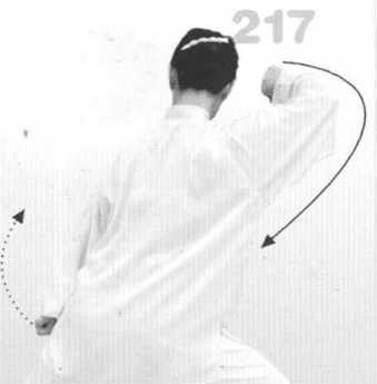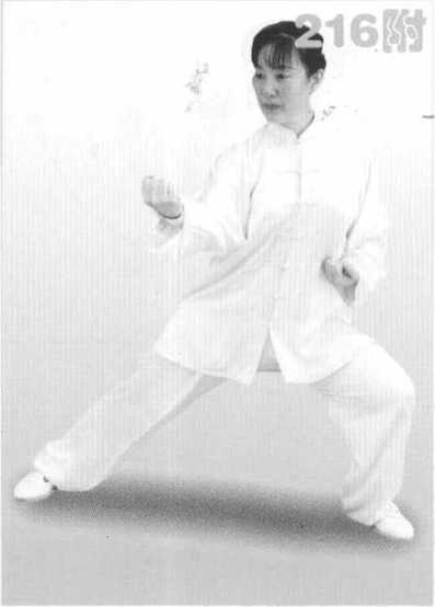(4) 上体继续左转,重心移向 左腿,右脚跟外展成横裆步;两掌 随转体向左平捋,同时逐渐握拳, 然后松腰、沉肩,左前臂外旋,左 拳收于左腰间,拳心向上,右前臂 外旋滚肘下沉,右拳高与胸齐,停 于体前,右臂半屈成弧形,拳心斜 向内。眼看右拳。(图216、216附)