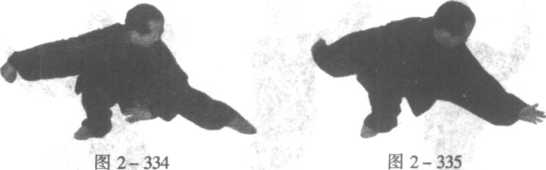 上体稍右转,右脚尖略外撇,随即身体重心移至右腿; 然后右腿慢慢屈膝下蹲,左脚跟外拧,左腿伸直成左仆步; 同时,左掌随转体自左经脸前划弧至右肩前,随后下落至小 腹前翻掌心顺左腿内侧向前穿出;右勾手仍在体右侧平举, 勾尖向下;目视左掌,胸向南偏东。(图2-333~335)