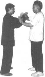 (五) 甲稍左转身,抽出右臂,屈肘立掌向乙脸前虚晃, 右肘则向乙上体进击,以打乱乙注意力,懈其肘靠劲。乙急 出左手,以手背接捆住甲右腕部,防住甲的进击。(图3-28)