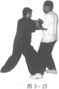 (二) 甲右臂内旋,右手挂掳住乙右腕部,左手仍粘扶于 乙右肘部,向后斜下方采捋乙;同时,右脚向右后方向撤一 步。乙随甲采势,右臂随伸,左手脱开甲肘自然下垂;同 时,右足向前(右后方)上一步,落于甲左脚内侧。(图3-25)