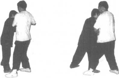 (三) 甲继续向右后采捋乙右臂,准备打拗劲。乙左足向 前上步(右后),落于甲右足前外侧;身体向右转,右臂屈肘 准备以肘靠迎住甲的拗劲。(图3-26)