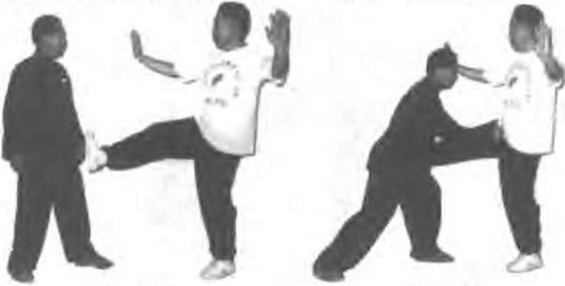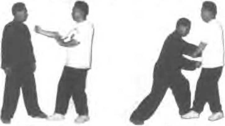 (一)搂拳栽捶击裆甲上.右步出右拳击乙胸部,乙左脚进半步.同时左手将 甲右拳向左搂吓右拳击甲裆部:(图432、33)图 4132 4133(二) 搂腿栽捶击腹甲突然抬起右脚踹乙腹部.乙迅速用左向左勾搂甲“脚腕部,同时出右拳栽击甲小腹(图4】34 135)