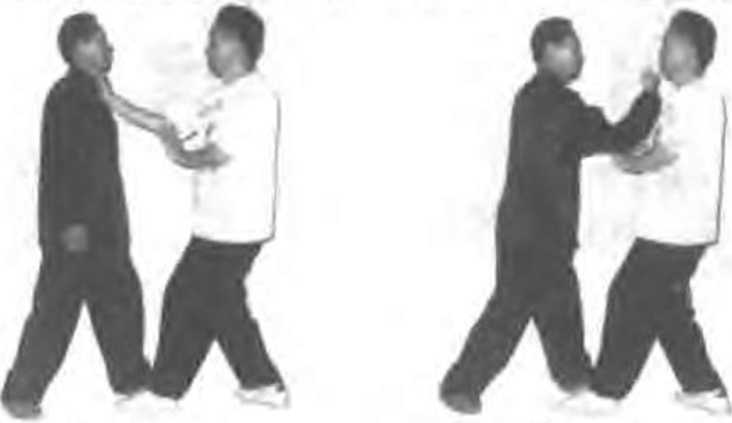 (一)别腿锁喉上:左步出左掌穿击乙咽喉,乙总脚迅速抢—步別住 甲左腿.同时右手抓掳住中左手腕部按,左手以食、中指 插击甲咽喉,(图4179, 180)图479 图4180(二抓手砸拳…上左步出右手突然插乙咽喉.乙左抓惺中右手腕网 内州力拧旋,右手成拳向上砸击中面部 (图418182) 4 8 4 182