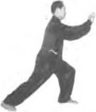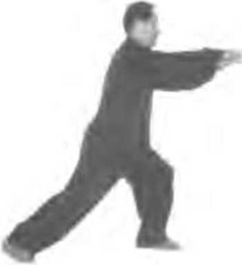 (3"上步推常!身体心前栘腿前'成左弓从; 同时.两向经腹前再向:向前推.掌心向前指尖 上,■腕与府齐平;力;胸叫尔,.(图264)