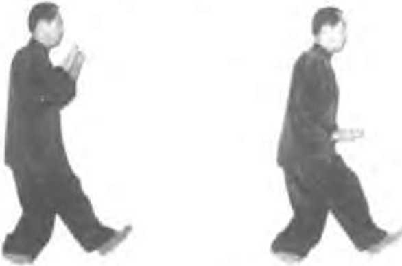 米收掌沐坐 怵霞心后移.腿1膝, 脚火上翘,同时,网慢慢分开网收至胸前翮掌落脾 前.购释屈时.掌心句下;视舫力"《图262、63)