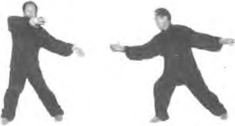 ⑴身体右转90度左行,脚尖外撇45度左荇。