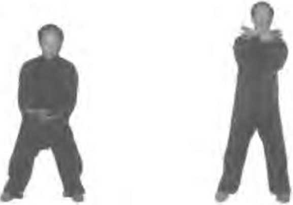 收脚合抱身本重心移左腿仃脚尖内扣向: 收1: .两脚距病间宽,身怀歌心随即移}两腿之间. 腿迩渐》成歼众步;时时1调:经腹舫向:埘弧.交