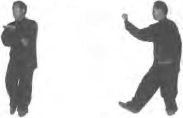 (I) 收脚握拳;左腿屈膝支撑身体心.沐稍左转, 右脚随之回收于左脚内舾.脚尖点地;同时.右小背内旋, 拳心翮转向下,经腹前间左《?摆茔左肋前;左掌由骱朐下. 向后上方糾摆屈左胸前,掌心向前方 (图 2 117)