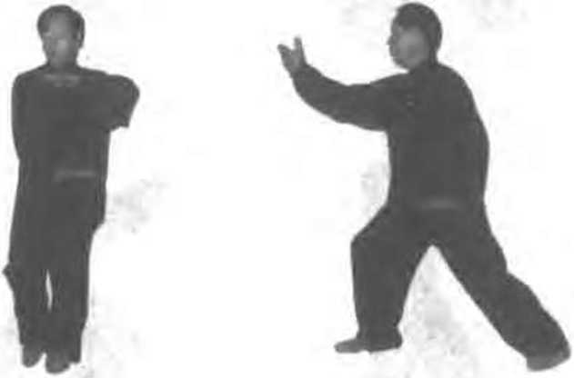 上体稍右移,左脚轻落于右脚前,脚前掌虚点地 面;随后身体左转,脚向后撤步,脚前掌先着地,慢慢全 脚踏实身体心移至左腿,枉脚随转体以脚掌为轴拧正成 右虚步;同时.左掌心翻转向上,然后下落撤至左腰侧;右 隼心翻转向上.自下向后上划弧平举,庙后肘折向前,经耳 ?(向舫推出,掌心向前,指尖朝上,目视前方。(图2 341,342)