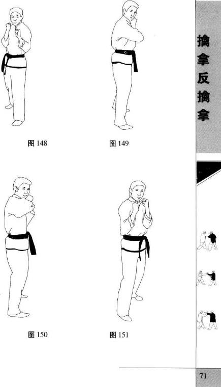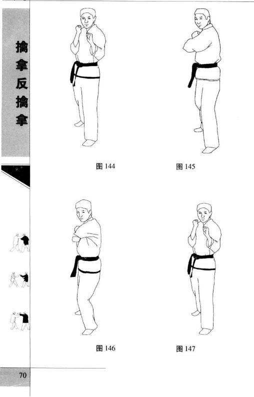 从立战姿势开始,左臂内旋平屈身体微右转左手置于右胸外,然后,肘尖向前撞击身体顺势微左转力达肘尖(图144-147)。要点转腰、顶肘要一致发力干脆。2右顶肘从立战姿势开始右脚上步或左脚撤步右臂内旋平屈右手置于左胸外然后,身体右转右臂发力肘尖向前撞击(图148-151)。要点右脚上步或左脚撤步与转腰、顶肘要协调同时发力要脆。搐擒拿反擒拿
