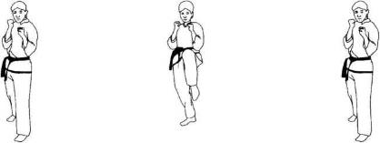 从防卫姿势开始,身体重心移至左腿同时右腿屈膝上提高过于腰右脚尖自然向下力达膝尖(图155-157)。