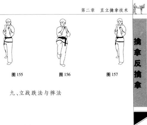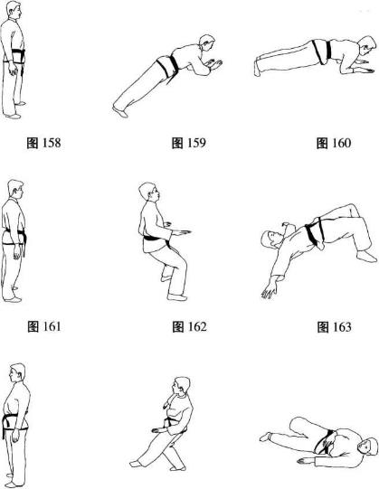 两脚分开站立上体前倒同时屏气两臂摆伸顺势双手撑地屈臂缓冲(图158-160)。