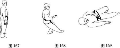 两脚分开站立右脚向左前伸左膝弯曲上体向右后倒同时屏气随后小腿、大腿、右臀依次触地,右手在体侧拍地(图167-169)。
