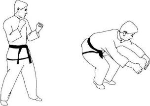 由立战姿势开始上左步并右步,身体下潜随即两臂伸开似抱对方膝关节窝处随后右脚跟步与左脚并步两手回拉肩部前顶然后恢复立战姿势(图170-173)。